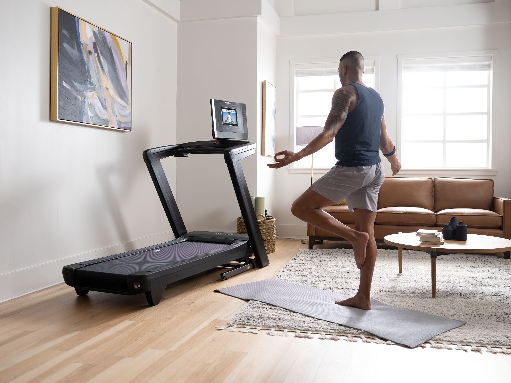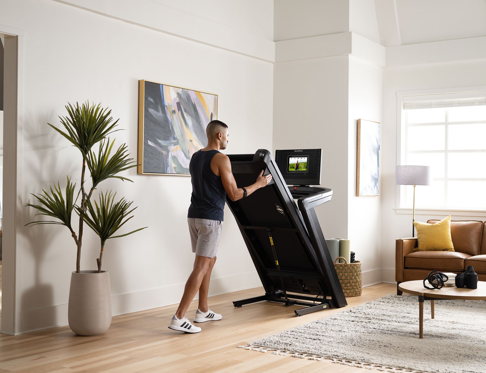 Независимо от того, предпочитаете ли вы использовать собственные наушники Bluetooth или два 2" динамика беговой дорожки, вы сможете слушать музыку и своего тренера одновременно. Когда вы будете готовы следовать за экспертом по йоге и силовым тренировкам, поверните монитор и занимайтесь рядом с тренажером. После окончания тренировки вы можете легко сложить беговую дорожку с помощью гидравлической системы EasyLift. Когда вы будете готовы к новой тренировке, нажмите на перекладину EasyLift под беговой дорожкой ногой и позвольте деке самой опуститься на пол.