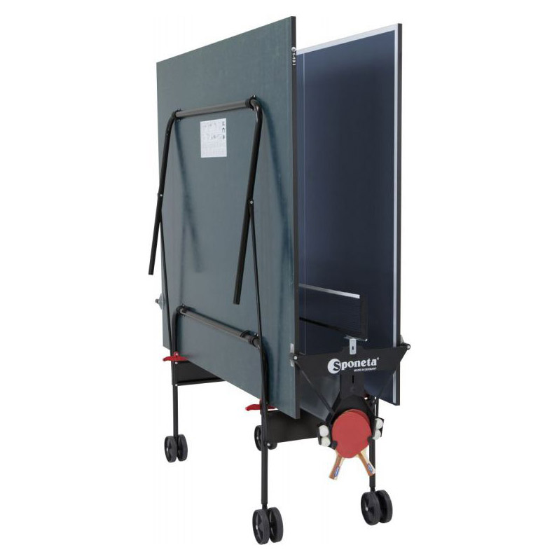 Стол теннисный Sponeta S1-13i - отличный складной теннисный стол для игры в закрытых помещениях. Каждый, кто играл в настольный теннис, никогда не забудет увлекательности и азарта этой игры. А сколько радости, бодрости и положительных эмоций приносит этот простой и доступный вид прикладной игры. В качестве материала для стола используется специально обработанная древесностружечная плита (ДСП) толщиной 19 мм, что обеспечивает очень хороший отскок мяча во время игры. На ДСП нанесено специальное антибликовое покрытие. Стол легко перемещается на 4-х колесах диаметром 125 мм, два колеса - маневренные. Конструкция стола позволяет тренироваться в одиночку.