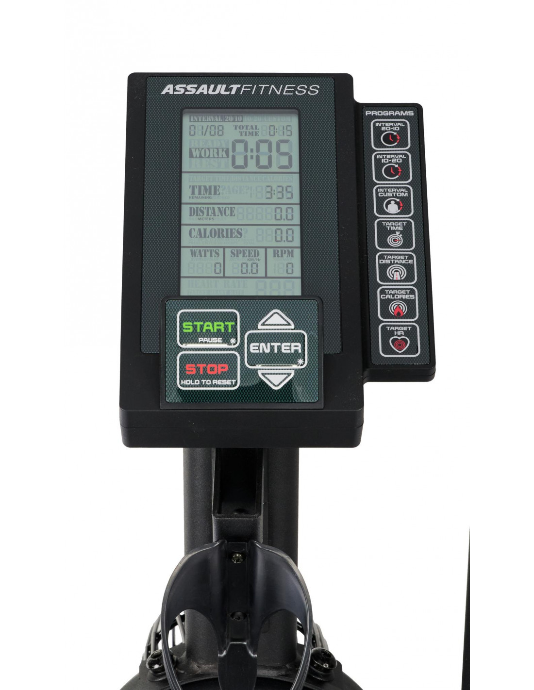 Рама виготовлена з високоміцної сталі та має порошкове покриття. Для гарантії довговічності та стабільності всі рухомі частини оснащені високоякісними промисловими підшипниками. Знімна консоль Assault Air Bike оснащена РК-екраном високої роздільної здатності, який оснащений кількома функціями. Простота експлуатації дозволяє як швидко розпочати тренування, так і виконати спеціально запрограмовану послідовність тренувань без особливих зусиль. Спортсмен може варіювати інтенсивність, дистанцію чи бажану результативність. Мотивуючі повідомлення підтримують спортсмена у хорошому настрої.