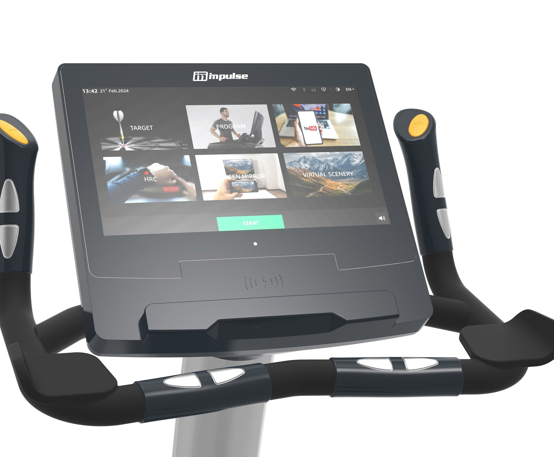 Большой 15,6" TFT-дисплей отображает ключевые параметры — сопротивление, время, расстояние, калории, пульс и частоту вращения педалей (RPM). Консоль поддерживает несколько языков, а также оснащена встроенными приложениями для развлечений и тренировок. Дополнительные функции, такие как беспроводная зарядка, USB-порт и отделения для аксессуаров, делают использование тренажёра ещё более удобным и современным.