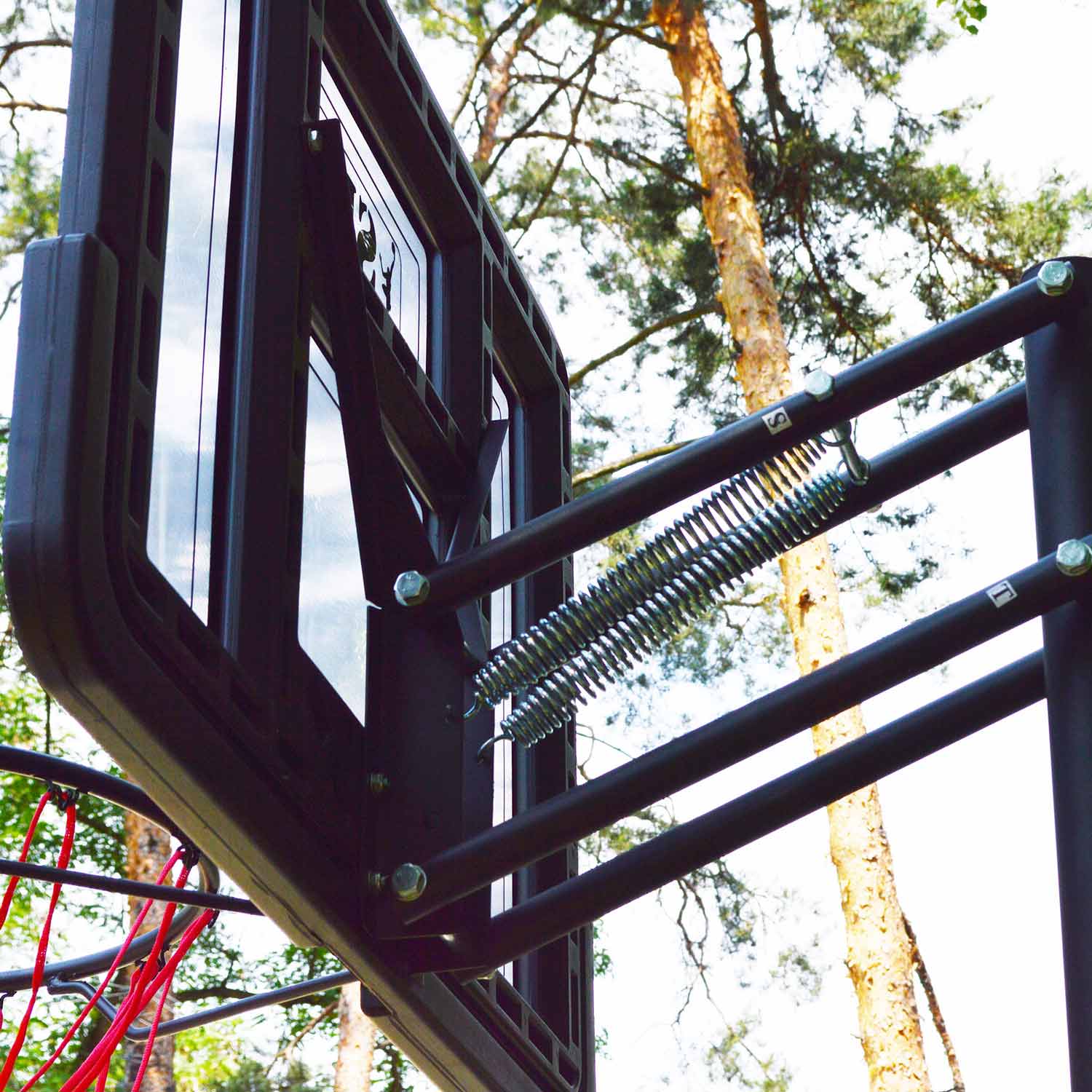 Міцна сталева конструкція стійки та щита, металеве кільце, яке має пружини в системі кріплення, дають амортизаційний ефект, гарантуючи тривале і безпечне використання.