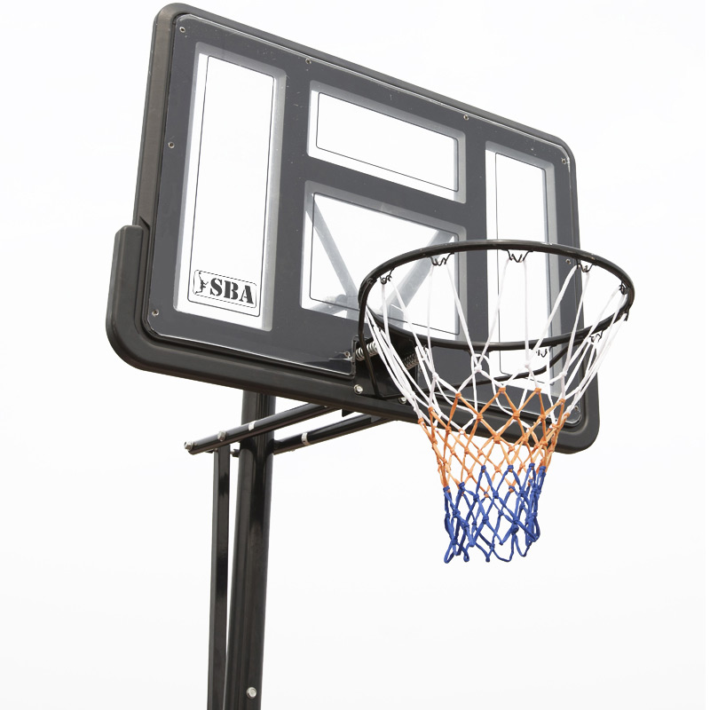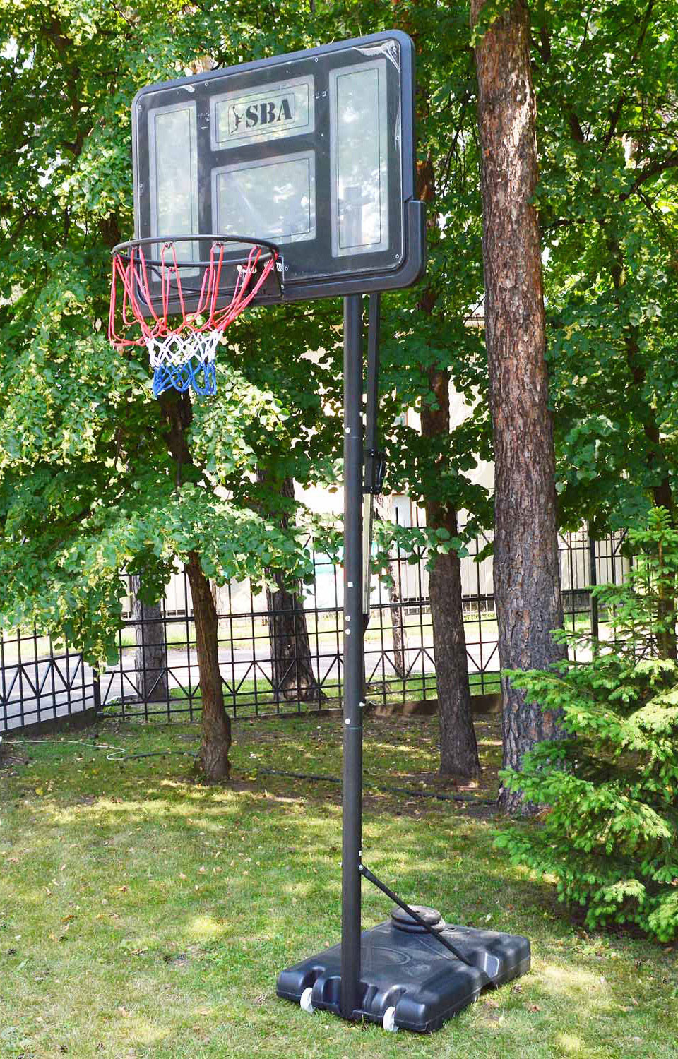 Баскетбольна стійка SBA S003-20 110x75 см використовується в умовах, коли немає можливості поставити стаціонарну баскетбольну стійку. Конструкція передбачає можливість встановлювати стійку тимчасово і в зручному довільному місці на тверду рівну поверхню.