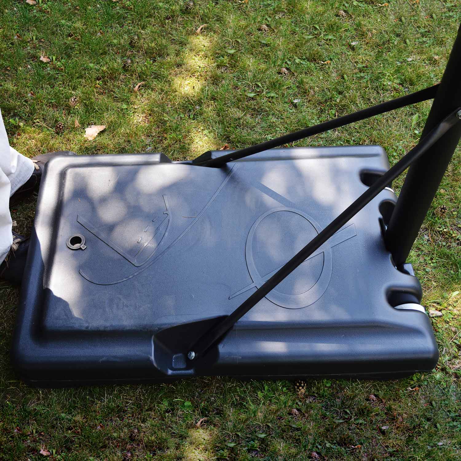 Надійність і стійкість конструкції забезпечує важка пластикова база, яка наповнюється водою або піском, в поєднанні з опорою самої стійки. Слід пам'ятати, що взимку, якщо температура впаде дуже низько, вода може замерзнути та зламати пластикову основу.